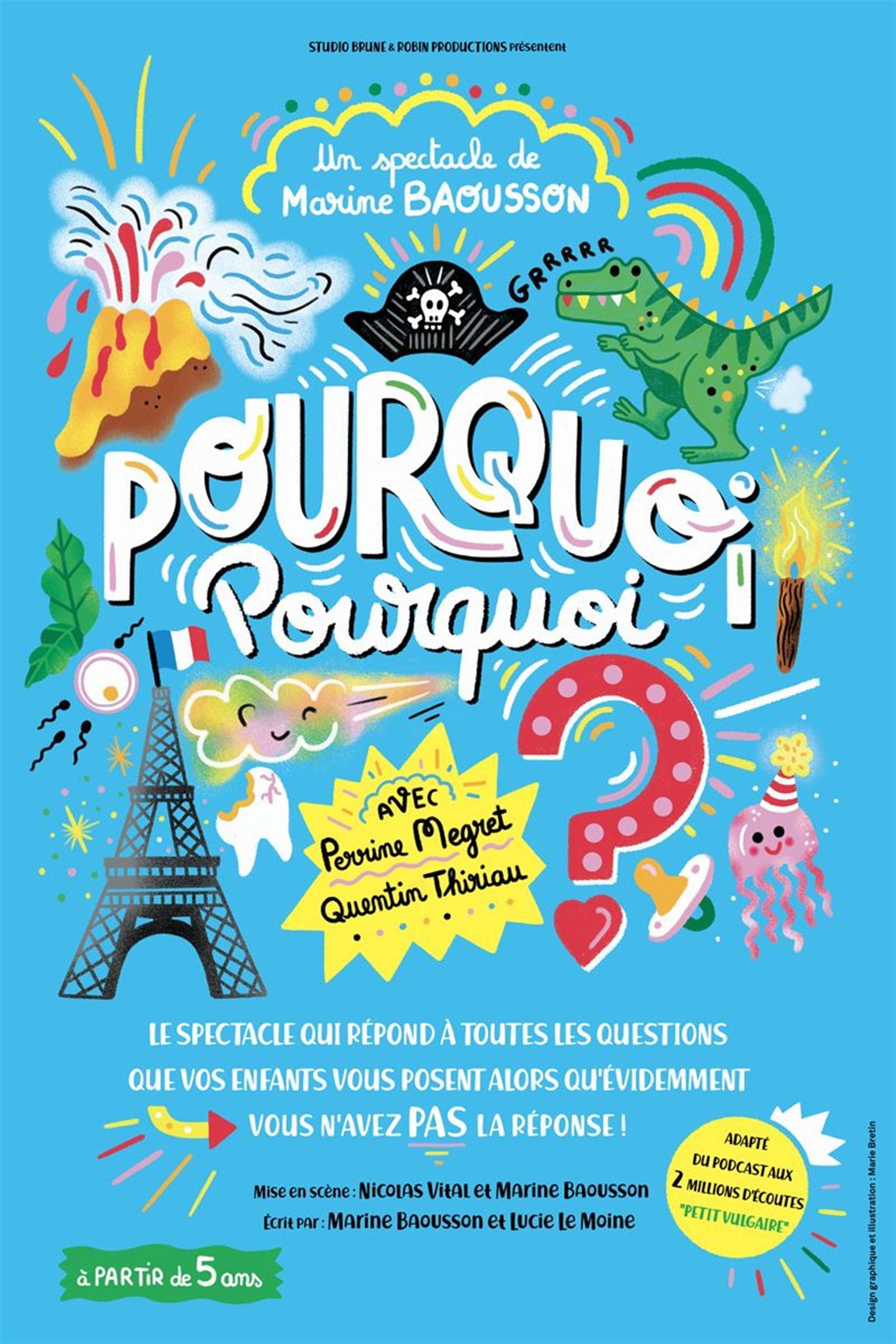 Adapté de Petit Vulgaire, le podcast de vulgarisation aux 2 millions d’écoutes, Pourquoi Pourquoi, c’est LE spectacle qui répond à toutes les questions que vos enfants vous posent, alors qu’évidemment… vous n’avez pas la réponse. Dans ce spectacle interactif, les enfants choisissent les sujets : les volcans ou les dinosaures ? La grotte de Lascaux ou La Tour Eiffel ? Les caries ou comment on fait les bébés ?